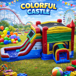 Add a burst of color and excitement to your next event with our Colorful Castle Double Lane Bounce & Slide! Featuring bright rainbow tones and classic castle styling, this inflatable is a perfect fit for birthdays, school events, and celebrations of all kinds. With jumping fun and two side-by-side slides, it delivers nonstop energy and smiles for guests of all ages. 😄🎈